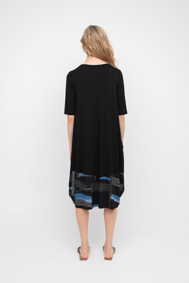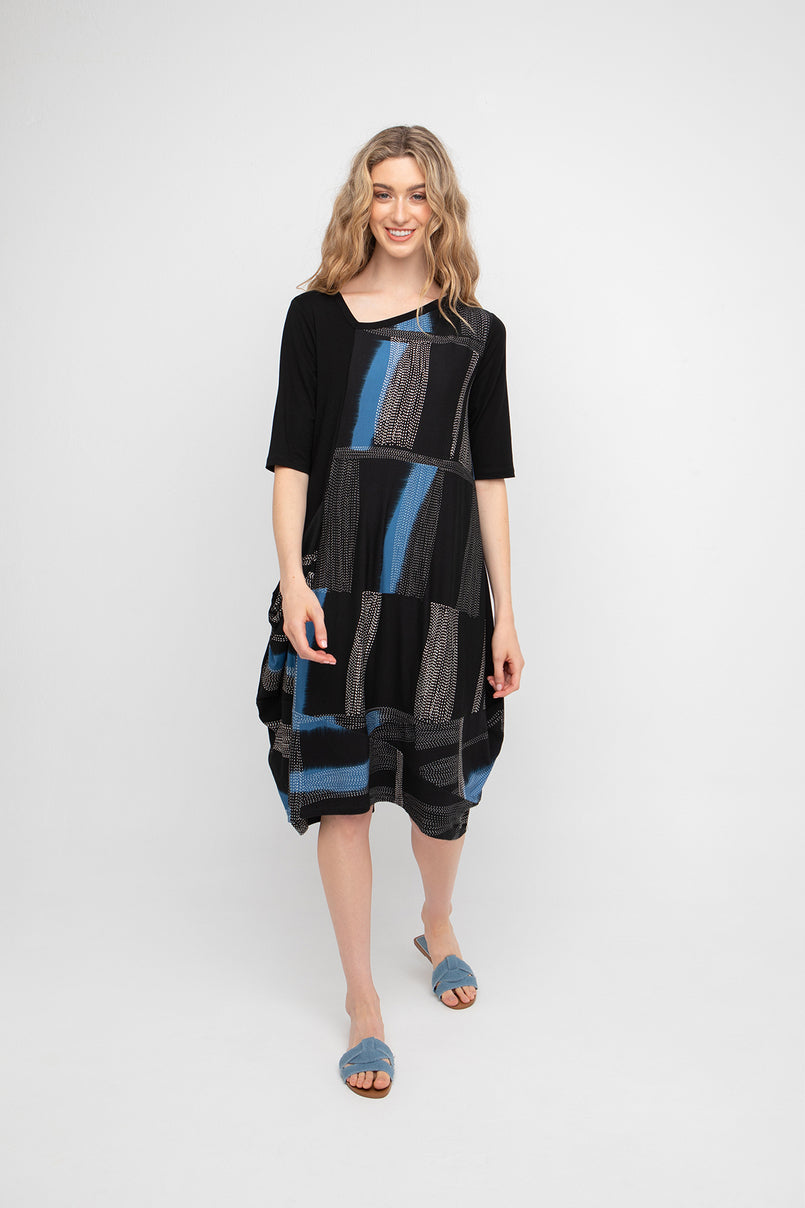 Jersey midi dress with angled neckline, elbow length sleeves and a drop side pocket in an abstract dot and splash pattern