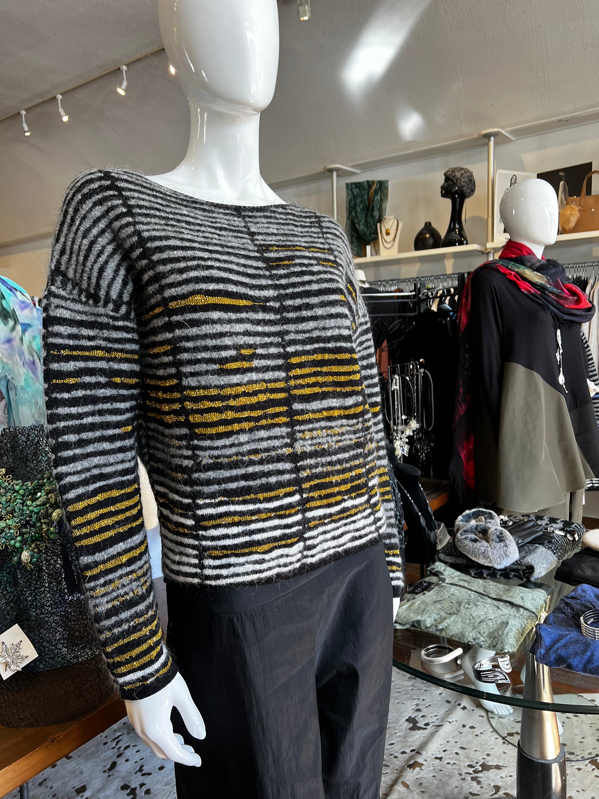 Experience comfort laced with color. This boatneck jacquard sweater showcases a splash of brilliance, set against the backdrop of viscose, mohair, and merino yarns.